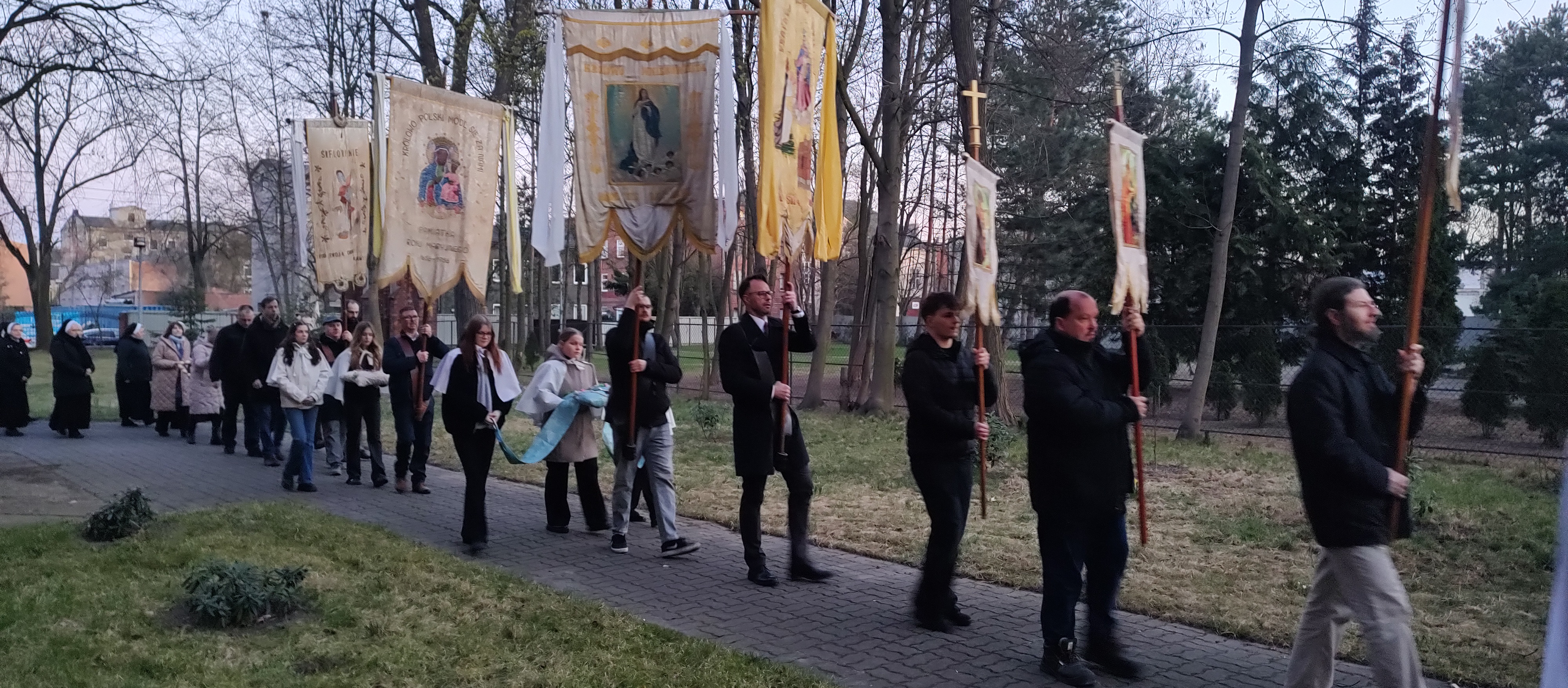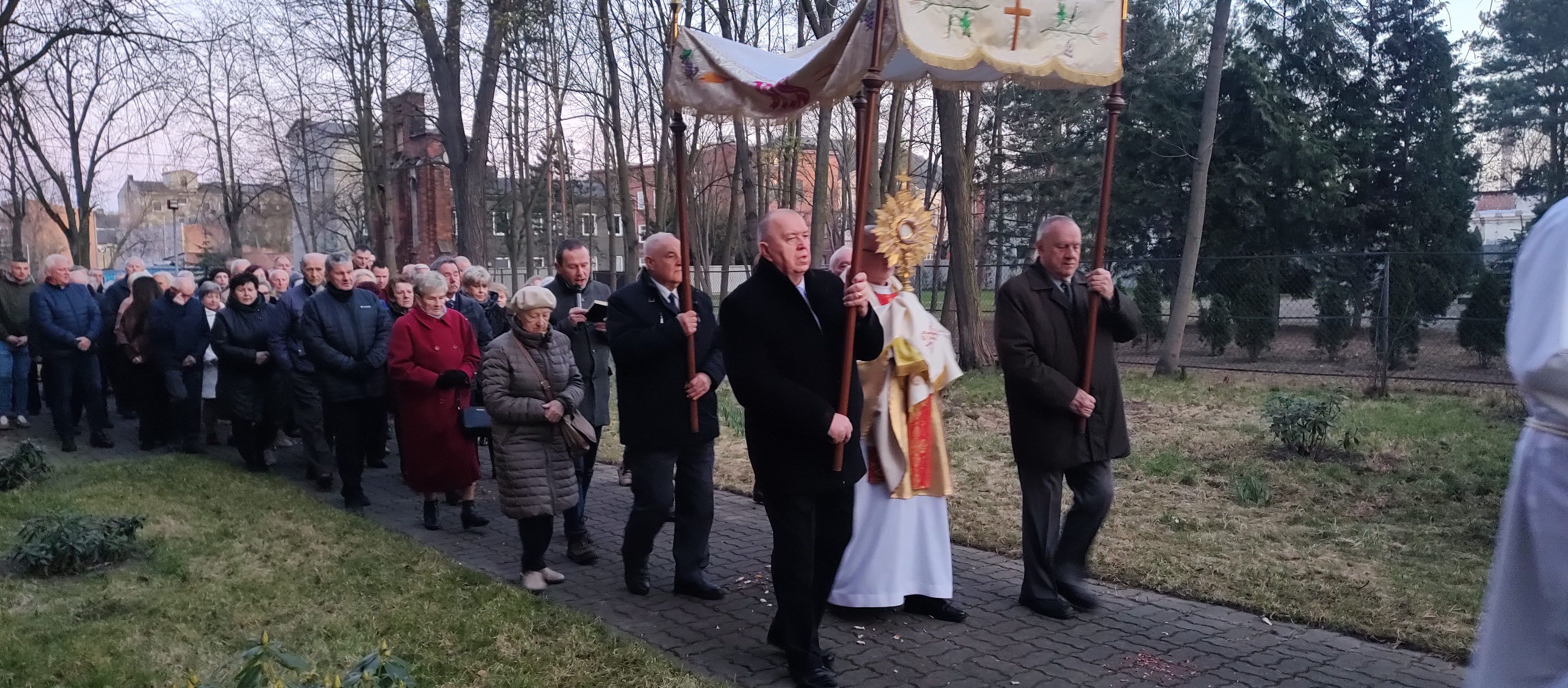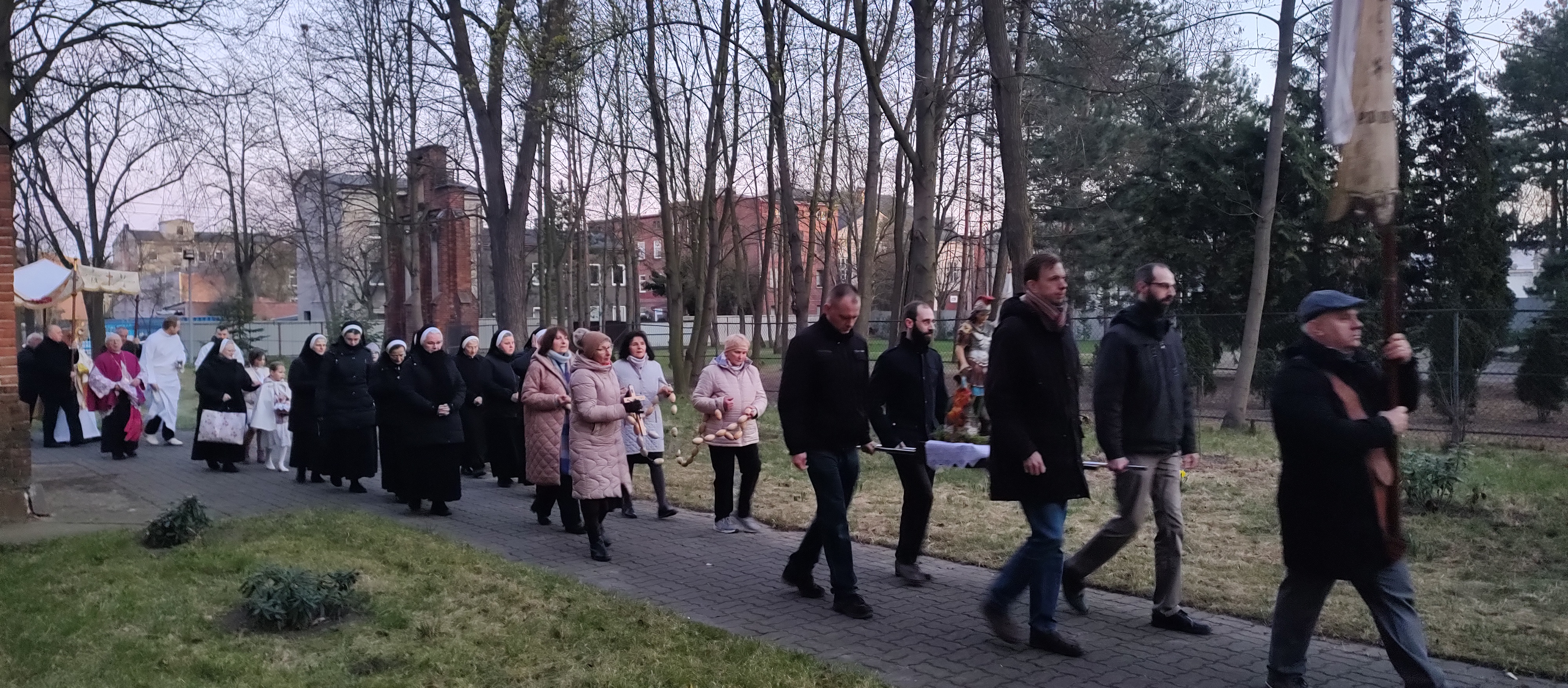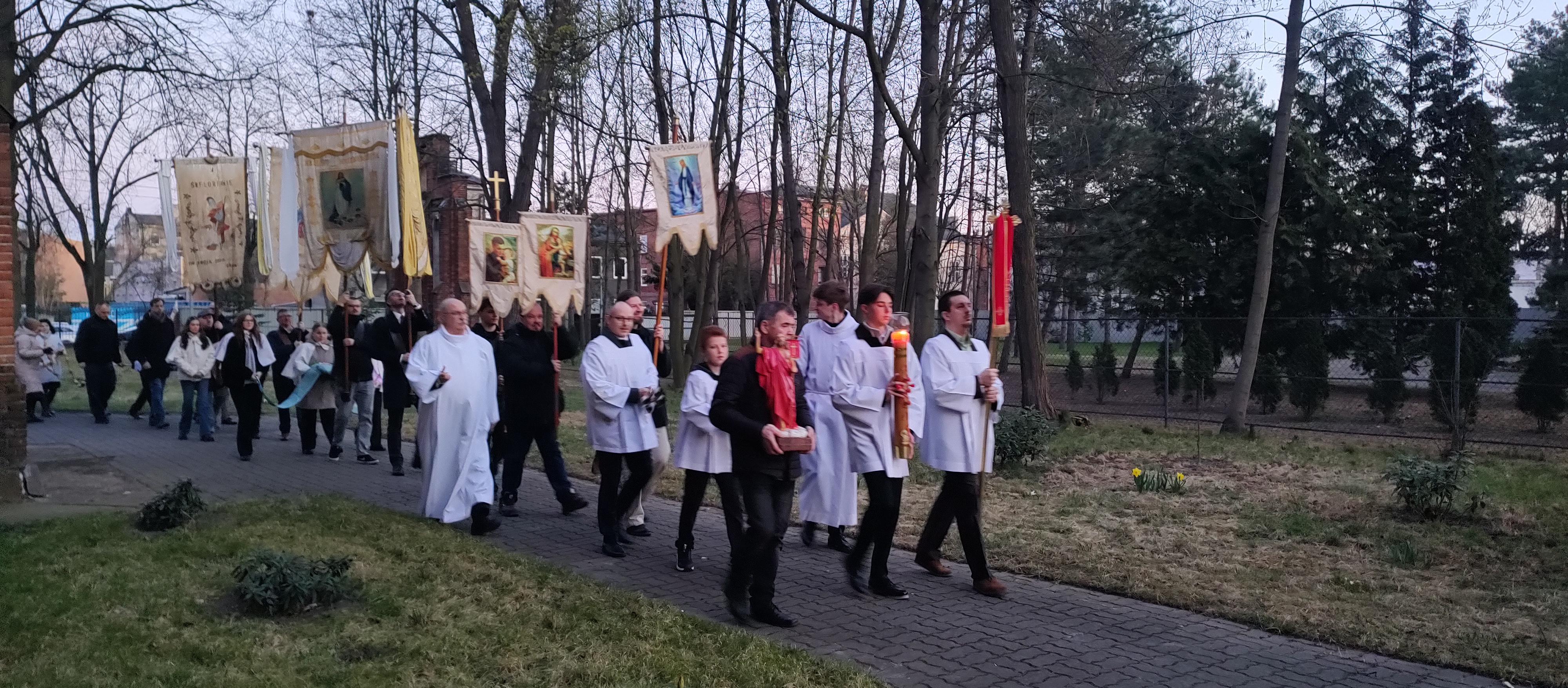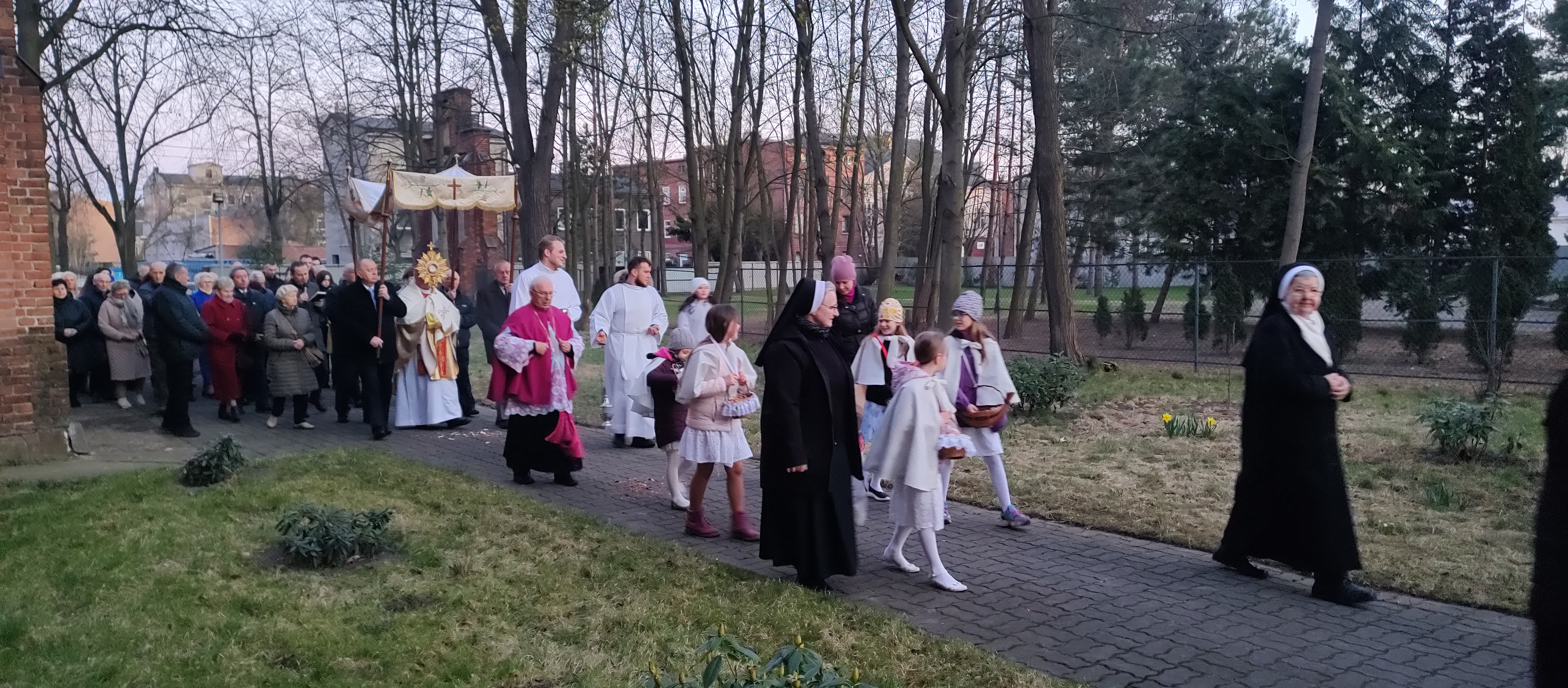 Niedziela Zmartwychwstania Pańskiego przypadająca 5 kwietnia 2026 roku rozpoczęła się od Mszy Świętej o godz. 6:00 rano. Na początku miała miejsce uroczysta procesja rezurekcyjna. Była obecna asysta niosąca sztandary, chorągwie, grupy modlitewne, dziewczynki sypały kwiatki przed Najświętszym sakramentem niesionym w monstrancji przez księdza proboszcza. Za nimi podażali wierni na znak wiary w żywą obecność Chrystusa w eucharystii (zapraszam dzieci, Asystę i grupy modlitewne).